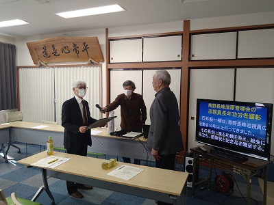 定例総会では12年間の長期にわたり熊野長峰巡視員としてご尽力いただいた石井新一さんに、功労者としての顕彰を行ないました。長年のご協力ありがとうございました。
